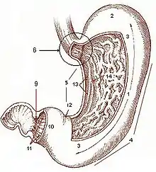 - (anatomy) stomach (extension of the digestive tract between the oesophagus and the small intestine)