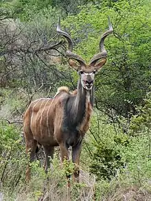 - A large, striped, African antelope of the species Tragelaphus imberbis (lesser kudu) or Tragelaphus strepsiceros (greater kudu).