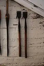 - bark spud, peeler bar, peeling spud, spud (implement for removing bark from felled timber)