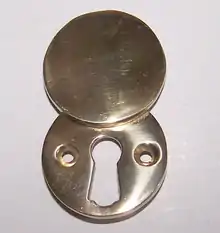 - an escutcheon (insignia around a doorknob's exterior hardware or a door lock's cosmetic plate)