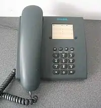- (by extension) A telephone connected by such a fixed wire, specifically not wireless/mobile.
