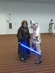 Two Star Wars cosplayers wielding lightsabers at the 2010 Tekkoshocon, an anime convention held in Pittsburgh, Pennsylvania, USA