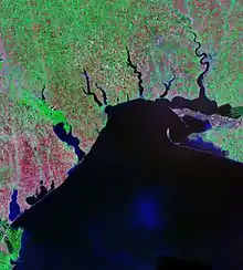 - A wide estuary formed as a lagoon at the mouth of one or more rivers, where flow is constrained by a bar of sediments (created by either the current of a sea or a sediment-saturated river), especially in the Black Sea region.