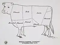 A diagram from the United States c. 1918 showing the lines between different cuts of whole sale beef, including the loin.