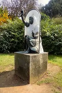 The statue Alice through the Looking-Glass in the grounds of Guildford Castle in Guildford, Surrey, England, UK, which depicts the character Alice from Lewis Carroll’s book Through the Looking-Glass (1871) entering the looking-glass world by passing through a looking-glass