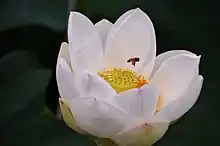 una abeja flota encima de un flor de loto