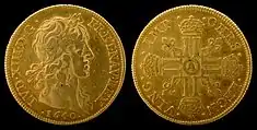 - (historical numismatics) Any of the gold coins first introduced in France under Louis XIII in 1640, based upon the Spanish doubloon.