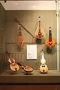 Various models of the Cretan lyra (sense 2) at the museum of Greek traditional instruments, Athens.