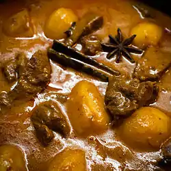 From Thai มัสมั่น (mát-sà-màn, “Muslim-like curry”), from Persian مسلمان (mosalmân, “Muslim”), from Arabic مُسْلِم (muslim, “Muslim”).