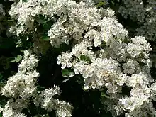- The flower of the hawthorn, Crataegus, especially the common hawthorn, Crataegus monogyna.
