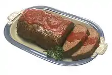 - A dish of ground meat (usually made from ground beef, although lamb, pork, veal, venison, poultry and seafood are also used) formed into a loaf shape, mixed with egg and breadcrumbs, then baked or smoked, and usually served in slices.