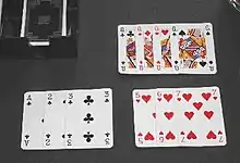 - (card games) Especially in games of the rummy family: a combination of playing cards which is announced or played to score points. [from late 19th c.]