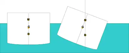 - A ship's metacenter (M) is the virtual intersection of two successive lines of action of the force of buoyancy when the ship heels through a very small angle. The initial position of the metacenter is used as a reference in stability calculations. The distance from a ship's center of gravity (G) to its metacenter is known as the metacentric height (GM). GM is a measure of the vessel's ability to right itself when experiencing an overturning moment. For the same vessel, a higher GM value indicates a greater initial static stability.