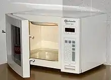 - An oven that uses microwave energy to heat food or other items placed within it.