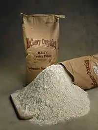 - flour (powdery foodstuff obtained by grinding cereal grains)