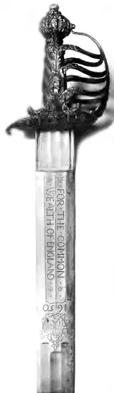 In popular belief, so named because the hilts sometimes depict a face, which is commonly believed to be that of King Charles I, executed in 1649; in fact, swords of this type with that face were used by both sides of the conflict even before Charles was killed. An alternative explanation for the name is that many such swords were donated to churches when their wielders died, and used in funerary displays.