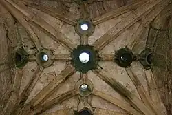 - The ground floor entrance, a gothic doorway, is in the east wall and gives access to a small vestibule with a murder hole. The stairs on the left leads up to a short landing, over which is a second smaller murder hole.
