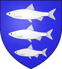 The canting arms of Roache: azure, three roaches naiant in pale argent.
