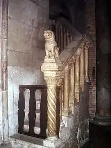 - (architecture) A sturdy pillar at the top or bottom of a flight of stairs, supporting the handrail.