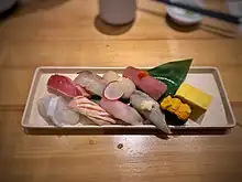 Borrowed from Japanese 握り (nigiri, “grasping, gripping”, short for 握り寿司 nigirizushi, literally “gripped sushi” from the way the sushi rice is molded in the hand).
