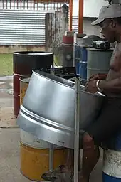 - a steelpan, a steel drum; a percussion instrument from the West Indies, originally made from oil barrels