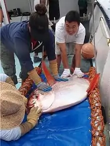 Researchers examine an opah (Lampris guttatus), which was later released