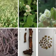 Cyathulae Radix (A). Flower of Cyathulae Radix (B, C). Roots of Cyathulae Radix (D, E). Transverse section of Cyathulae Radix (F)