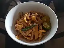 - a Filipino dish made from various pork, goat, or beef tripe or offal (internal organs), with sautéed spices, such as julienned ginger, chilis (siling mahaba), bamboo shoots (labong), carrots, bell pepper, tomatoes, garlic, onions, and black pepper, among other ingredients, especially in the cuisine of Central Visayas and Mindanao