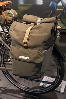 - A large basket or bag fastened, usually in pairs, to the back of a bicycle or pack animal, or carried in pairs over the shoulders.