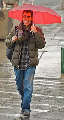 Un home cun paraugas vermello. (A man with a red umbrella.)