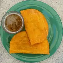 - (Jamaica) A pastry with various fillings and spices baked inside a flaky shell, often tinted golden yellow with an egg yolk mixture or turmeric.