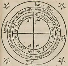 Four pentagoni around the magic circle, from the 1565 edition of the grimoire Heptameron.