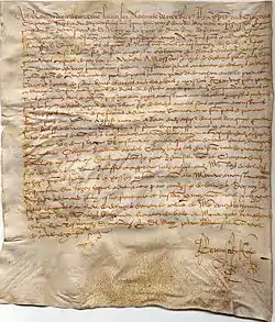 - es simtgadīgo ķieģeļu kaudzē atradu vecu manuskriptu... tas bija arābu burtiem ar melnu un sarkanu tušu aprakstīts pergaments ― I found an old manuscript in a pile of hundred-year-old bricks... it was a parchment covered with Arabic letters in black and red ink