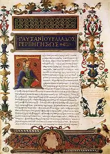 A page from a 1485 manuscript of the Ἑλλάδος περιήγησις (Helládos periḗgēsis; Description of Greece), a periegesis by the Greek traveller and geographer Pausanias (c. 110 – c. 180), from the collection of the Laurentian Library in Florence, Italy