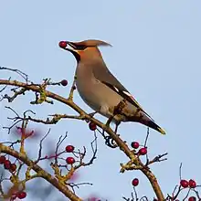 2. (less specifically) A waxwing, any bird of the genus Bombycilla