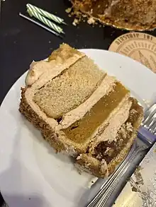 A slice of a piecaken containing a cake, pumpkin pie, pecan pie, and apple pie filling on the top