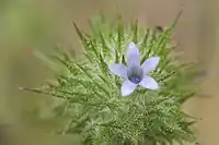 The flower-bearing inflorescence of the skunkweed (Navarretia squarrosa), a species of pincushionplant (genus Navarretia; sense 2.6), has frilly green bracts with soft spines, making it resemble a pincushion.