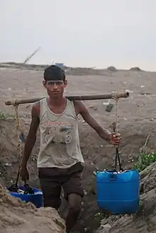 - (Sri Lanka, dated) A flexible pole supported on one shoulder, with a load suspended from each end.