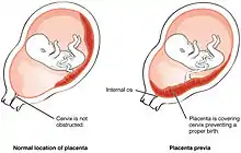 - (pathology) A complication of pregnancy in which the placenta is inserted partially or completely in the lower segment of the uterus (above the opening of the cervix).