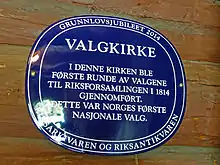 Plakett (plaque) on the Valgkirke (election church), Kvikne, Tynset kommune. About 300 churches were used in Norway's first national election.