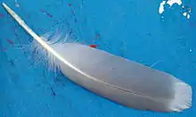 - (archaic, literary and poetic) A feather of a bird, especially a large or showy one used as a decoration.