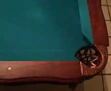 - (sports, billiards, pool, snooker) An indention and cavity with a net sack or similar structure (into which the balls are to be struck) at each corner and one centered on each side of a pool or snooker table.