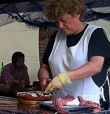 - At diverse places along the oak grove there were octopus post, with their bronze cauldrons overflowing with octopuses boiling over large bonfires which covered in smoke clouds all the fair, and menaced to choke all of the attendants with the exception of the cook, who apparently had shark gills which allowed her to advertise her merchandise shouting "Buy my octopus...! It's so delicious, boys... so delicious!"