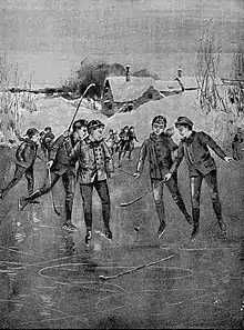 - (sports) A form of ice hockey played outdoors on the surface of a frozen lake or pond, or other body of water.