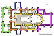 In this plan of St Mary's Church, Reculver, in north-east Kent, the porticus (sense 1) of the 7th-century church are represented by the extensions to north and south from the main structure, which is in yellow. Other colours represent later additions.