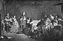 An engraving of John Pettie’s 1863 painting George Fox Refusing to Take the Oath at Houlker Hall, A.D. 1663. It depicts George Fox (standing left of centre), one of the founders of the Religious Society of Friends whose members are known as Quakers, in Holker Hall being required to take an oath by judges of the neighbourhood, including Justice Rawlinson (right, hand raised). As Quakers refused to take oaths, they were often charged with the offence of praemunire. This in fact happened to Fox’s wife Margaret Fell (shown seated behind him).