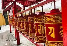 - (Buddhism) A rotating cylinder either inscribed with or containing prayers, mainly used by Tibetan Buddhists.