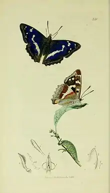- A large, dark brown and white (female), or purple and white (male) butterfly, Apatura iris, of the family Nymphalidae.