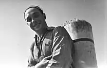 puttonyos, 1959 (a man carrying a wooden basket on his back during grape harvest)