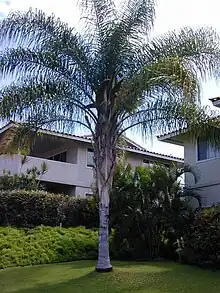 - Syagrus romanzoffiana, a medium-sized palm native to South America, widely planted in the tropics and subtropics for the fine texture of its fronds